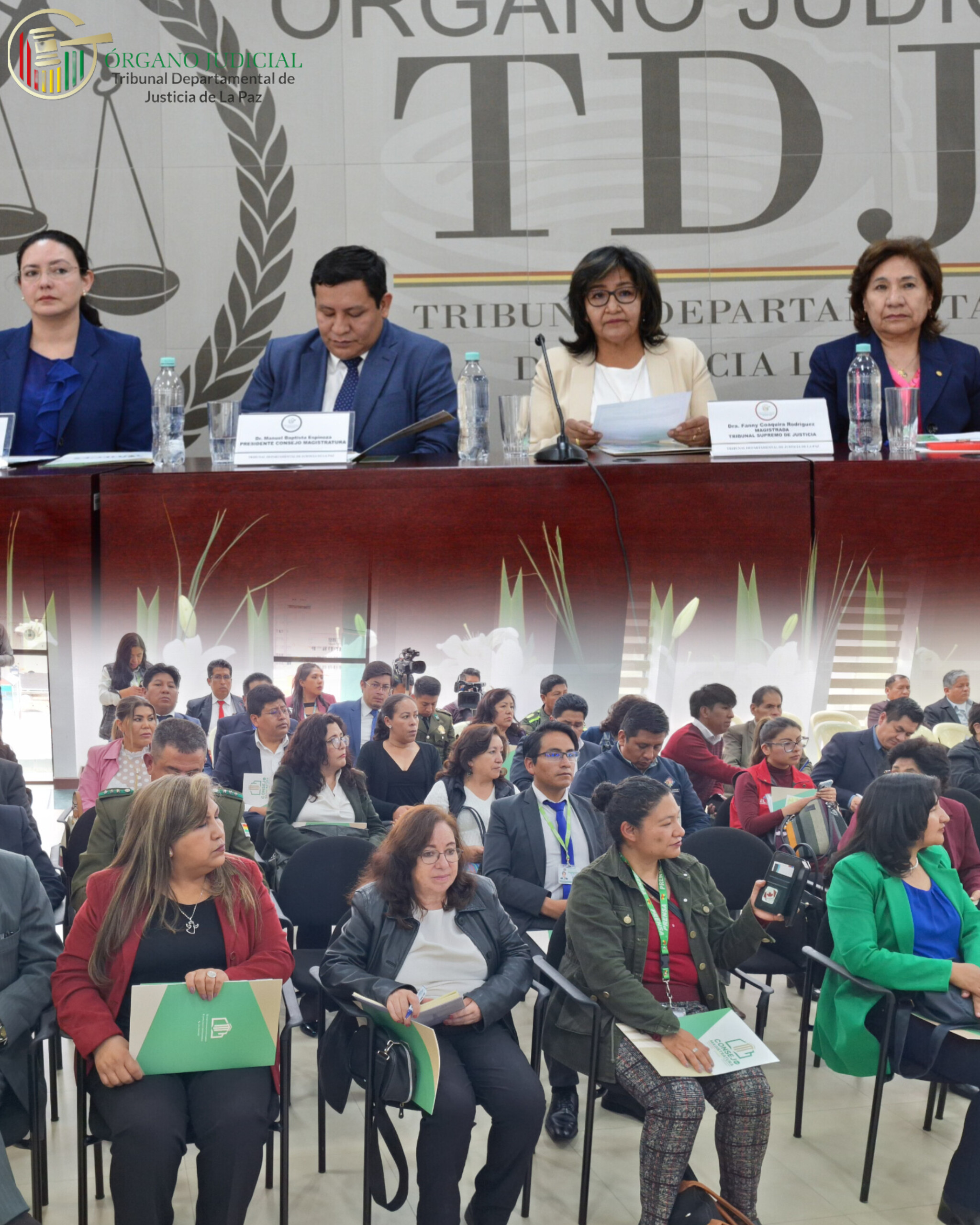 | 1408 | CERRAMOS CON ÉXITO LAS TRES JORNADAS DE ANÁLISIS DEL DOCUMENTO DE EVALUACIÓN A JUECES | La Paz, 3 de octubre de 2025, (TDJ-La Paz).- Las altas autoridades del Órgano Judicial que representan nuestro departamento de La Paz: Magistrada del Tribunal Supremo de Justicia (TSJ), Dra. Fa... | 2025-10-03 |  | |