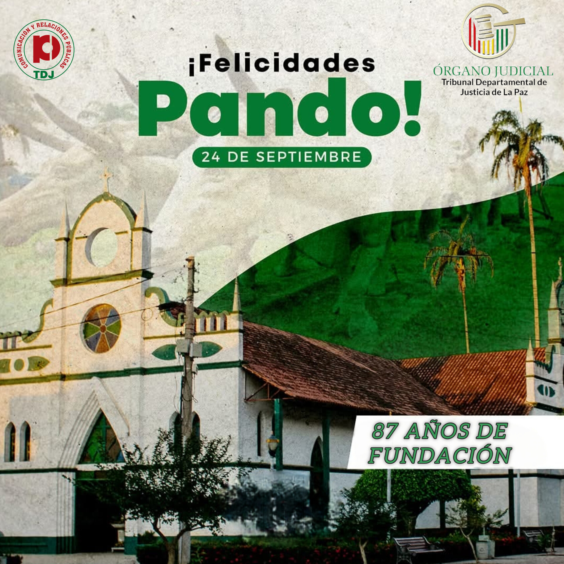 1403 | SALUTACIÓN DEL TRIBUNAL DEPARTAMENTAL DE JUSTICIA DE LA PAZ POR EL ANIVERSARIO DEL DEPARTAMENTO DE PANDO | La Presidenta del Tribunal Departamental de Justicia de La Paz, Msc. DAEN. Margot Pérez Montaño y la Sala Plena, rinden un homenaje sincero y fraterno al querido Departamento de Pando, a... | 2025-09-24 |  | |
