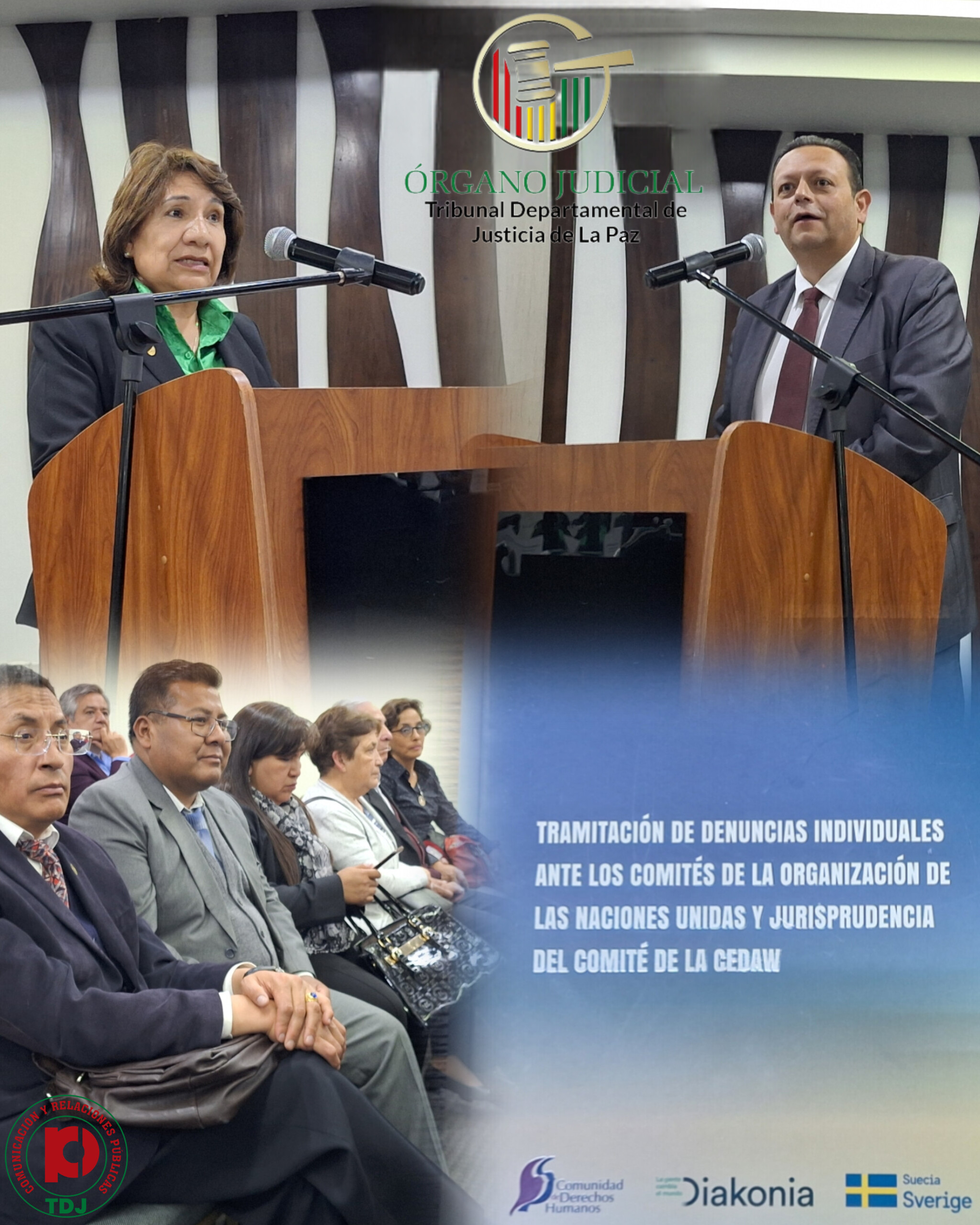 1404 | VOCAL DEL TDJ PRESENTÓ EL LIBRO: TRAMITACIÓN DE DENUNCIAS ANTE LA ONU, PRESIDENTA DEL TDJ FUE INVITADA A LA PRESENTACIÓN | La Paz, 25 de septiembre de 2025 (TDJ).- En calidad de autor, el Vocal de la Sala Constitucional Primera del Tribunal Departamental de Justicia de La Paz (TDJ), Dr. Fernando Zambrana Sea, realizo la p... | 2025-09-25 |  | |
